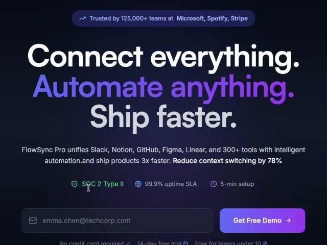 FlowSync Pro unifies Slack, Notion, GitHub, Figma, Linear, and 300+ tools with intelligent automation.and ship products 3x faster.