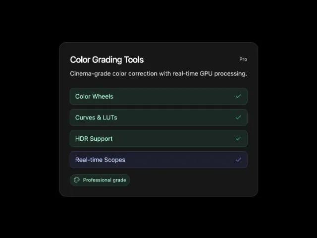 <p class="mt-2 text-sm text-neutral-300">Cinema-grade color correction with real-time GPU processing.</p>