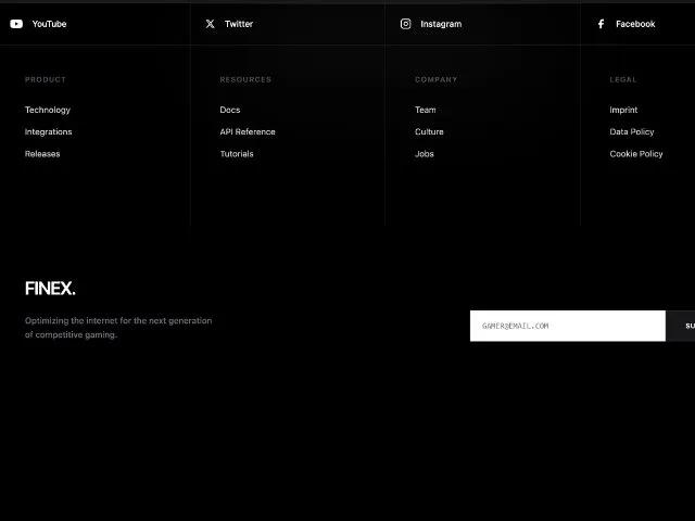 Темный футер с ссылками соцсетей, навигацией и формой подписки на рассылку. Адаптивный дизайн для SaaS и игровых сайтов.