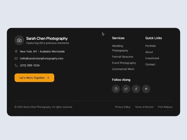 <p class="text-white/50 text-xs font-geist">© 2024 Sarah Chen Photography. All rights reserved.</p>