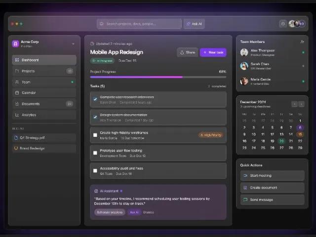 <p class="text-sm text-white/90">"Based on your timeline, I recommend scheduling user testing sessions by December 10th to stay on track."</p>