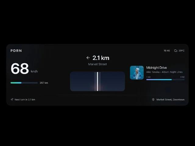 HUD-панель для авто: спидометр, навигация, медиа. Темная тема, стекломорфизм. Идеально для интерфейсов автомобилей.