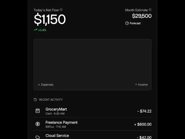 Анимированная карточка для финансов: чистый поток, оценка месяца, график доходов/расходов, список транзакций. Адаптивный дизайн, Tailwind CSS.