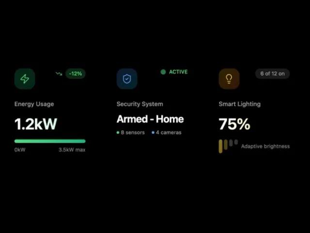 Адаптивная сетка карточек Glassmorphic для дашборда умного дома. Отображает статистику (температура, энергия, безопасность, свет) с анимацией и иконками.