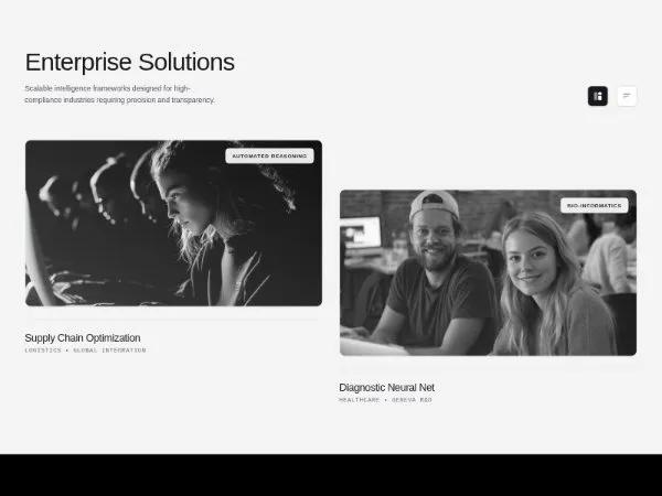 Адаптивный раздел для демонстрации корпоративных решений. Переключатель вида (сетка/список), анимированные карточки. Идеально для кейсов и проектов.