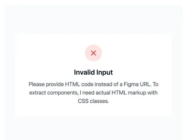 Ошибка: Невалидный HTML. Компонент отображает сообщение об ошибке, когда вместо HTML-кода предоставлена ссылка на Figma. Используется для уведомления пользователя.