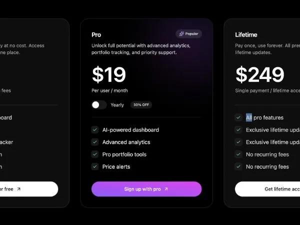 Адаптивная таблица цен с переключением тарифов (год/месяц). UI-компонент для SaaS-лендингов, созданный на Tailwind CSS.