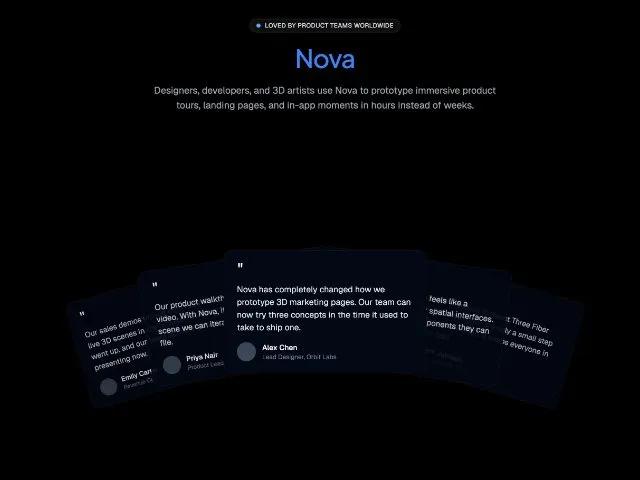 <p class="mb-4 text-base font-geist text-gray-300">Nova has completely changed how we prototype 3D marketing pages. Our team can now try three concepts in the time it used to take to ship one.</p>