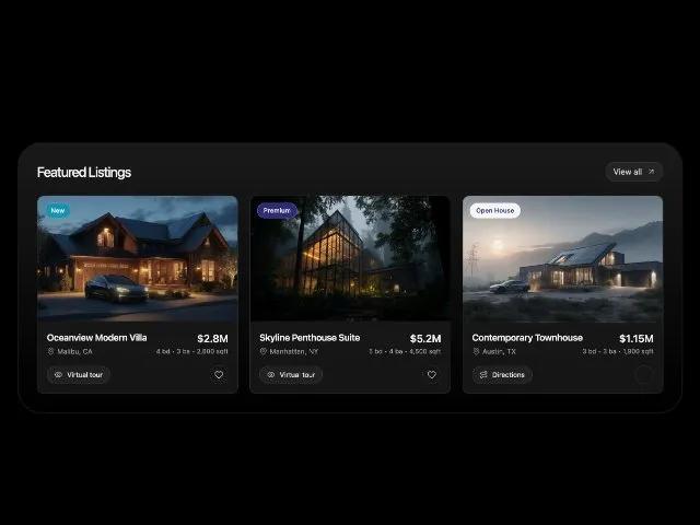 Сетка отзывчивых карточек объектов недвижимости в темном дизайне. Идеально для демонстрации избранных предложений на сайтах недвижимости.
