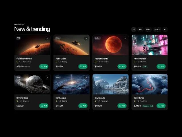 Сетка товаров для игрового магазина на Tailwind CSS. Фильтры по платформам, адаптивный дизайн, карточки игр с ценой, рейтингом и кнопками. Для маркетплейсов.
