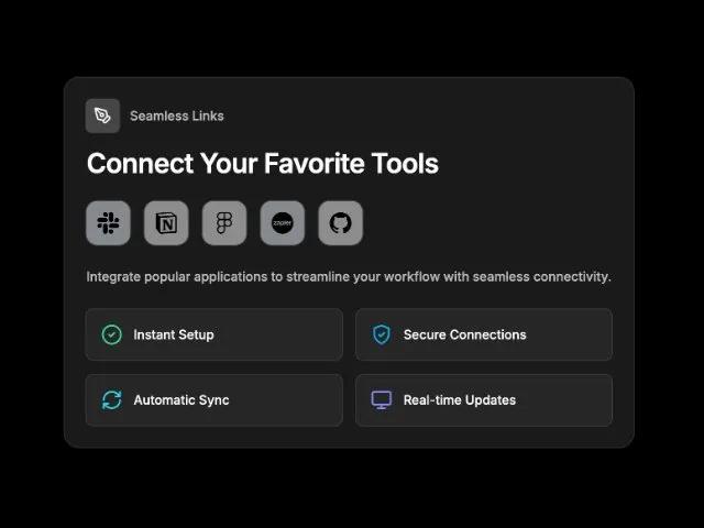 Glassmorphic карточка для отображения интеграций приложений с логотипами брендов и ключевыми функциями. Идеально для визуализации опций подключения.