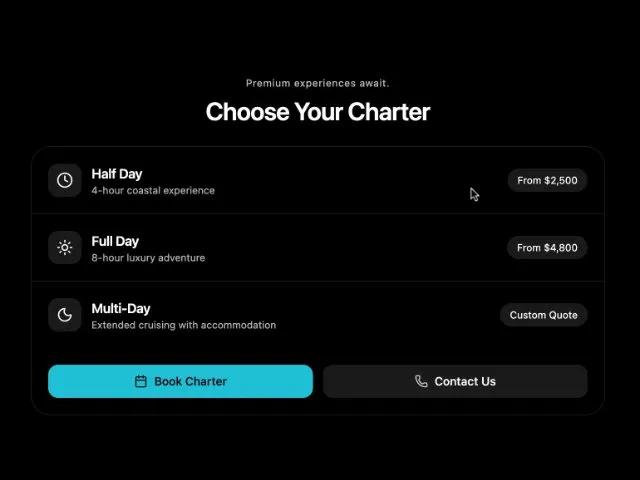 Секция цен с CTA на Tailwind CSS. Отображает пакеты услуг с иконками, стекловидной размытой картой и динамическими ссылками. Идеально для страниц бронирования.