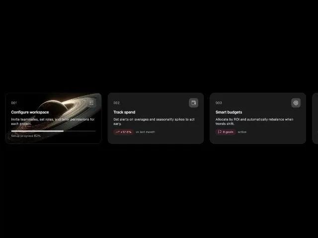 Сетка из 4 стекловидных карточек с иконками и анимацией прогресса. Идеально для дашбордов, SaaS и лендингов.