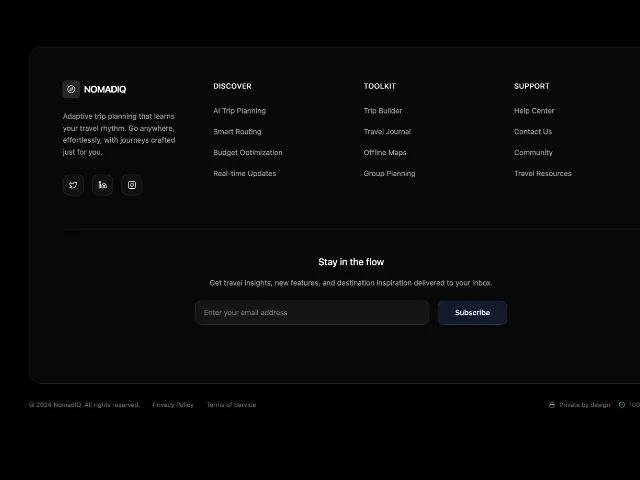 Glassmorphic футер с лого, ссылками, соцсетями и формой подписки. Адаптивный дизайн для сайтов SaaS, travel, marketing.