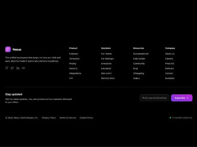 Адаптивный футер с стекловидным дизайном: ссылки, подписка на рассылку, соцсети. Идеален для SaaS и корпоративных сайтов.