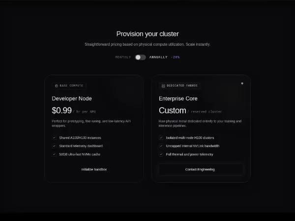 Секция цен на GPU Cloud с переключением оплаты. Интерактивные карточки, темный стиль Tailwind. Идеально для SaaS, инфраструктурных лендингов.