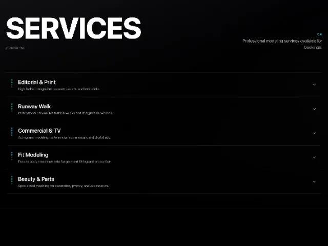 Секция со списком услуг с градиентным фоном и интерактивными элементами. Использует Tailwind CSS. Идеально для портфолио и сайтов агентств.