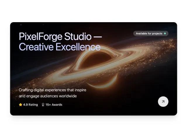 Большая карточка 'Hero' для портфолио с фоновым изображением и наложением. Отображает основную информацию, статистику и рейтинг.