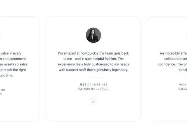 Адаптивная сетка карточек отзывов с анимацией при наведении. Идеально для лендингов и сайтов SaaS для демонстрации клиентских отзывов.