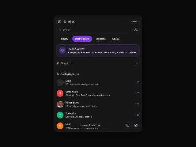 Панель уведомлений в почте с поиском и фильтрами. UI-компонент для дашбордов, почтовых клиентов и мессенджеров.