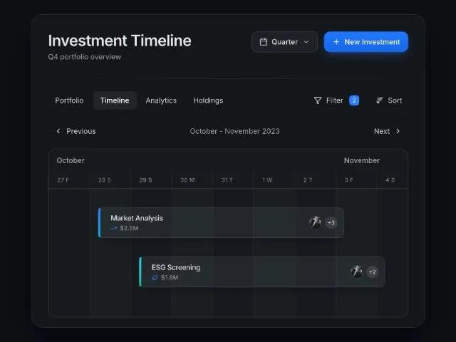 Адаптивная дашборд-карточка с таймлайном инвестиций. Фильтры, сортировка, выбор периода, модальное окно добавления. Идеально для финансов.
