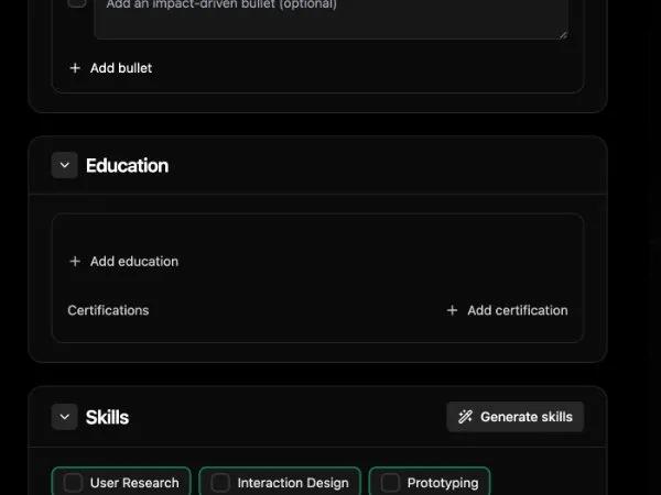 Интерактивный конструктор резюме с предпросмотром: создавайте и редактируйте разделы резюме (опыт, образование, навыки) с AI-подсказками и мгновенным предпросмотром. Идеально для карьерных порталов.