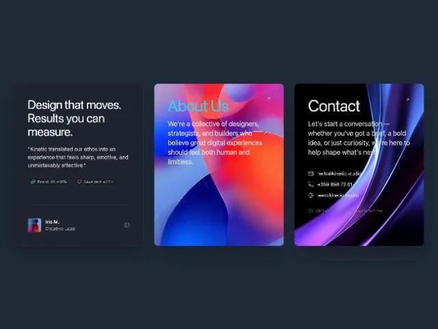 Адаптивная сетка из 3 анимированных карточек: отзыв, о нас, контакты. Glassmorphism, смены цвета при наведении, SVG-иконки. Для лендингов и сайтов агентств.