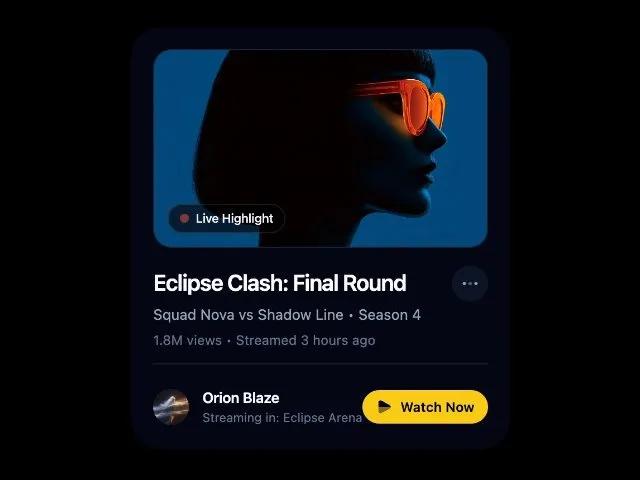 Карточка видео-хайлайта: миниатюра, статус, название, информация о матче, статистика просмотров, профиль стримера и кнопка "Смотреть сейчас". Для игровых и стриминговых UI.