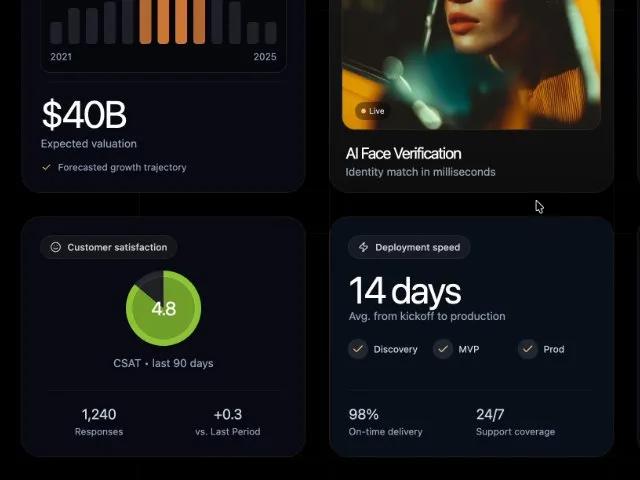 Секция с карточками KPI и анимированным тикером логотипов. Отображает метрики и социальные доказательства для SaaS и AI лендингов.