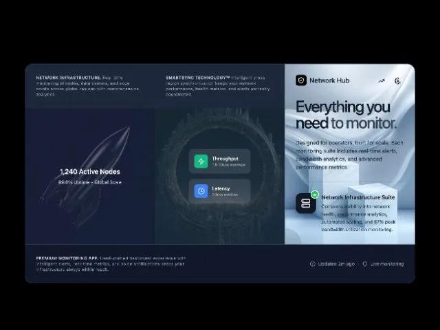 Секция дашборда для мониторинга сети. Отображает метрики, статус и аналитику в реальном времени. Адаптивный дизайн, Tailwind CSS.