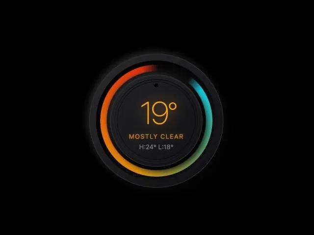 Круговой погодный виджет в стиле неоморфизм. Отображает температуру, условия, мин/макс. Идеален для дашбордов и UI погоды.