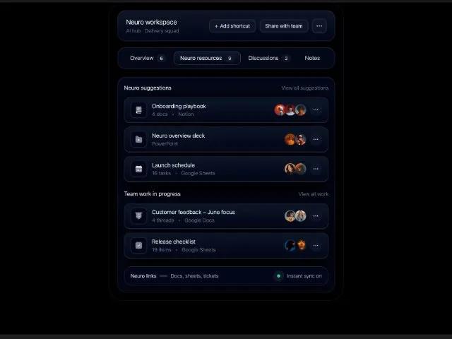 Шаблон карточки дашборда для отображения ресурсов AI хаба и командной работы. UI-компонент с темным дизайном, вкладками и статусами, создан с помощью Tailwind.