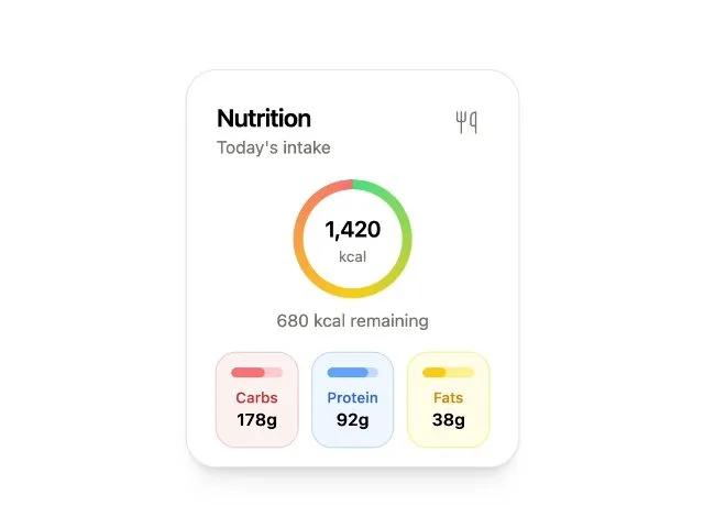 Карточка с питательными веществами: калории, БЖУ и прогресс. Идеально для дашбордов здоровья, фитнес-приложений и трекеров диеты.