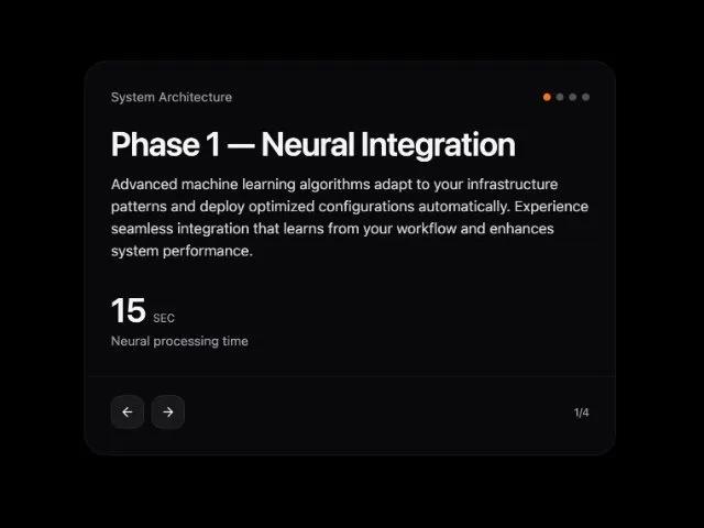 Адаптивная карточка Tailwind для деталей этапа с навигацией. Отображает метрики, стрелки пред/след, индикатор страницы. Идеально для роадмапов, онбординга, слайдеров.