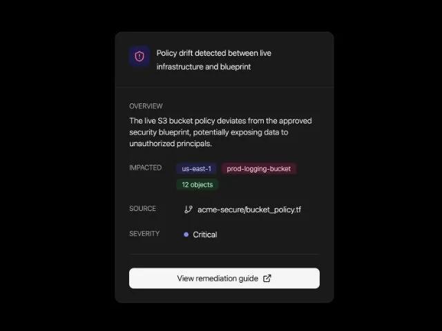 <h2 class="text-sm leading-6 font-light tracking-tight text-gray-100">Policy drift detected between live infrastructure and blueprint</h2>