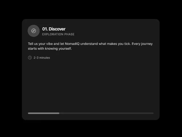 <p class="text-sm text-white/80 font-geist">Tell us your vibe and let NomadIQ understand what makes you tick. Every journey starts with knowing yourself.</p>