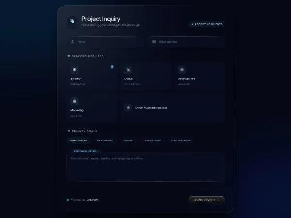 UI-компонент: карточка формы запроса проекта. Адаптивная, интерактивная форма с полями для ввода, выбора услуг и деталей. Идеально для сайтов агентств и фрилансеров.