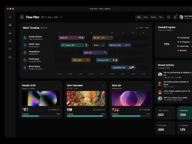 Адаптивный дашборд управления проектами с таймлайном, карточками, графиком прогресса и KPI. Для SaaS и продуктивных приложений.
