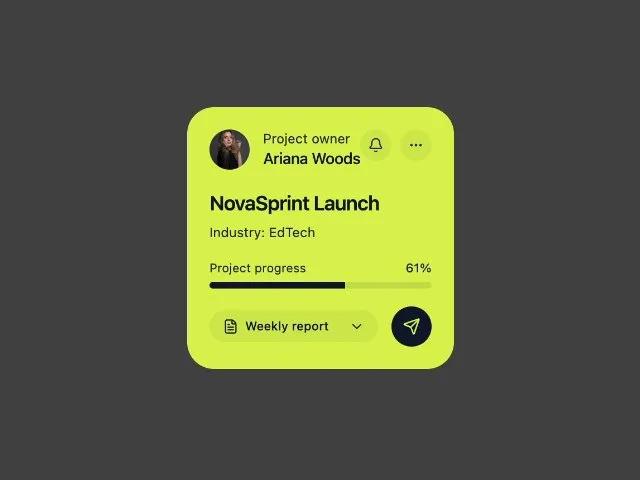 Карточка сводки проекта: информация о владельце, название, прогресс, уведомления, опции. UI-компонент для дашбордов.