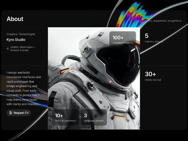 Адаптивная карточка профиля с фото и статистикой. Tailwind CSS. Идеальна для портфолио, персональных страниц, секций 'О нас'.