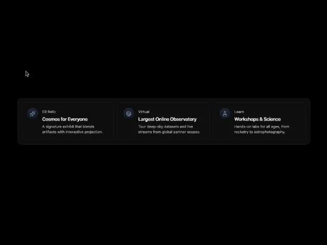 Секция адаптивных карточек с иконками, эффектами при наведении и размытием фона. Идеально для лендингов и демонстрации фич.
