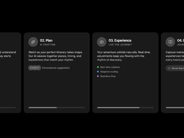 Адаптивная сетка карточек процесса из 4 шагов (Discover, Plan, Experience, Reflect). Идеально для онбординга и демонстрации функций. Tailwind CSS.