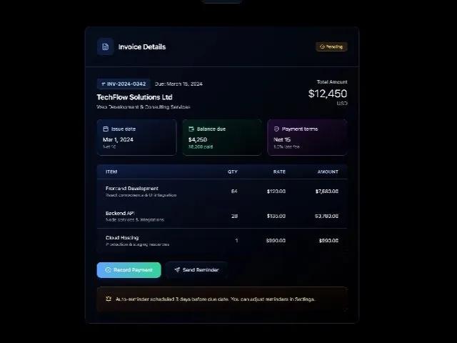 Адаптивная карточка инвойса с деталями: клиент, суммы, статус, даты, позиции, баланс. Кнопки для платежей и напоминаний. UI для дашбордов, биллинга.