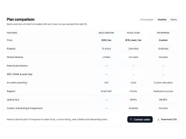 Адаптивная таблица сравнения цен SaaS. Сравнение тарифов Solo, Team, Enterprise с переключением месяца/года, иконками и кнопками CTA.