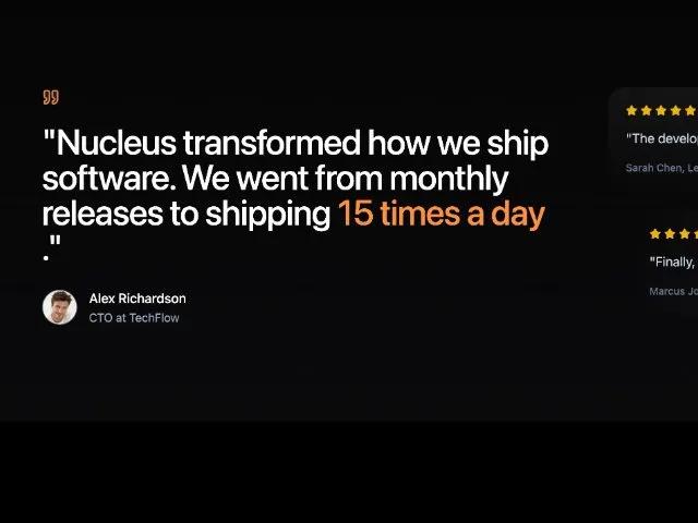 Адаптивный раздел отзывов с вращающейся цитатой и карточками рейтинга. Идеально для лендингов SaaS. Tailwind CSS.