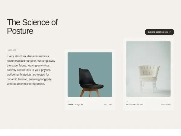Секция с интерактивной галереей WebGL для демонстрации мебели, улучшающей осанку. Адаптивный дизайн с Tailwind CSS.