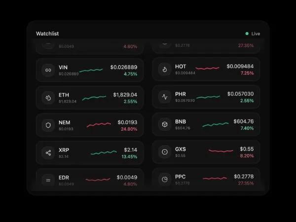 Скриптовый виджет списка криптовалют в Tailwind CSS. Отображает логотипы, цены, % изменения и графики. Автоматическая прокрутка CSS marquee с градиентами. Для дашбордов и финтех.