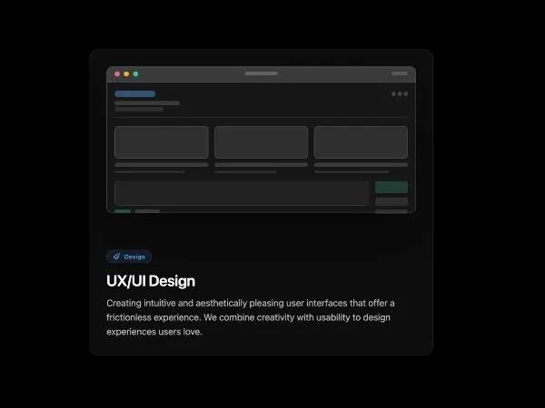 Интерактивная карточка Tailwind с браузерным макетом для демонстрации услуг. Идеально для портфолио агентств и лендингов.