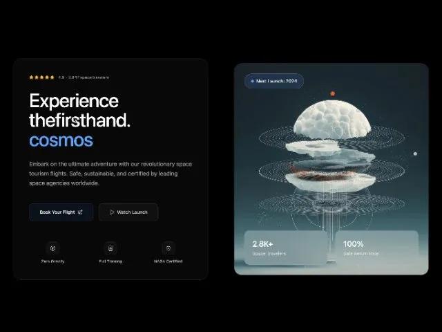 Hero-секция для лендинга космического туризма. Стеклянный блок с рейтингом, CTA и иконками фич. Адаптивный, современный дизайн.