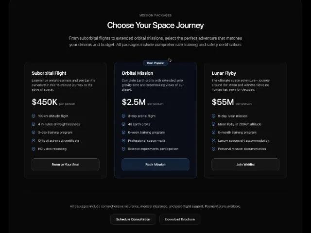 Карточки цен на космический туризм: 3 тарифа (суборбитальный, орбитальный, лунный) с описанием и ценами. Glassmorphic дизайн.